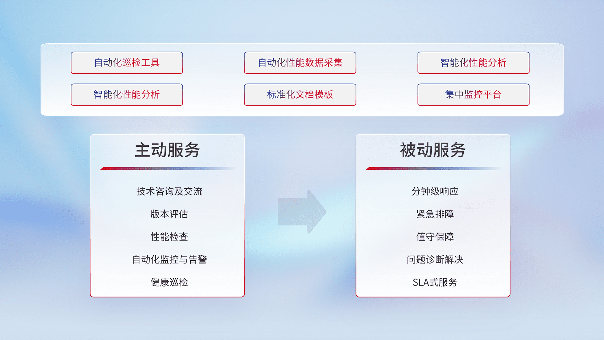 智能化工具和标准化文档,,,,保障服务质量,,,提供主动服务(包含技术咨询、、、、版本评估、、、、性能检查、、、、自动化监控与告警、、健康巡检)和被动服务包含(分钟级响应、、、紧急排障、、、、值守保障、、、问题诊断解决、、、SLA服务)。。。